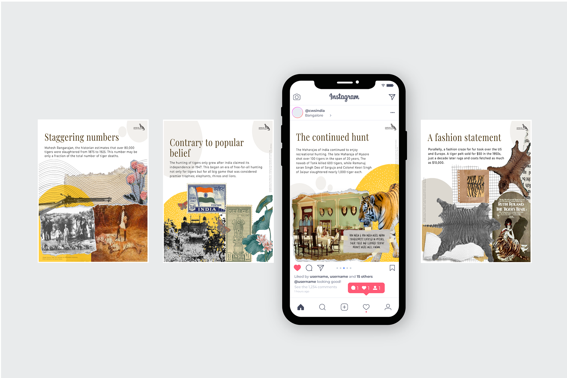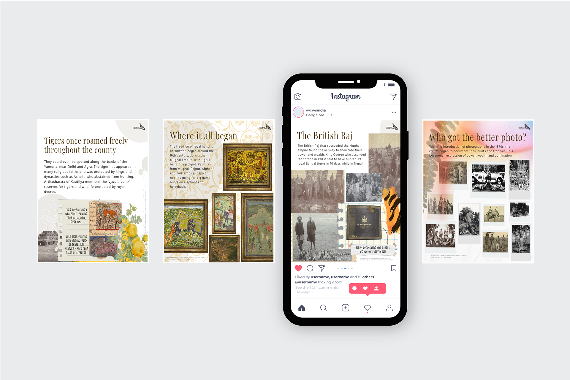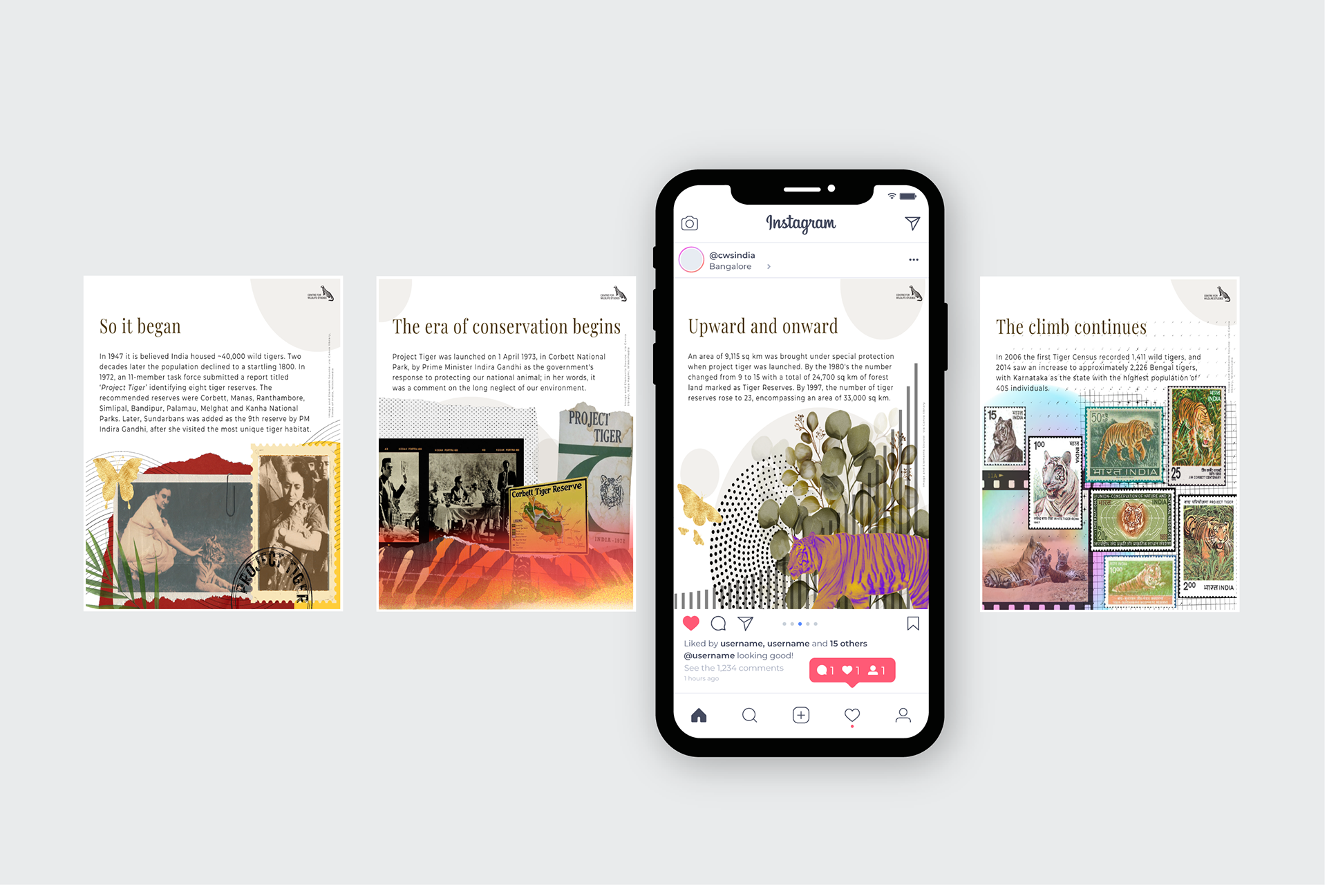 Content strategy, copy and design for the celebration of 50 years of Project Tiger in India, created for the Centre for Wildlife Studies, India's social media platforms.