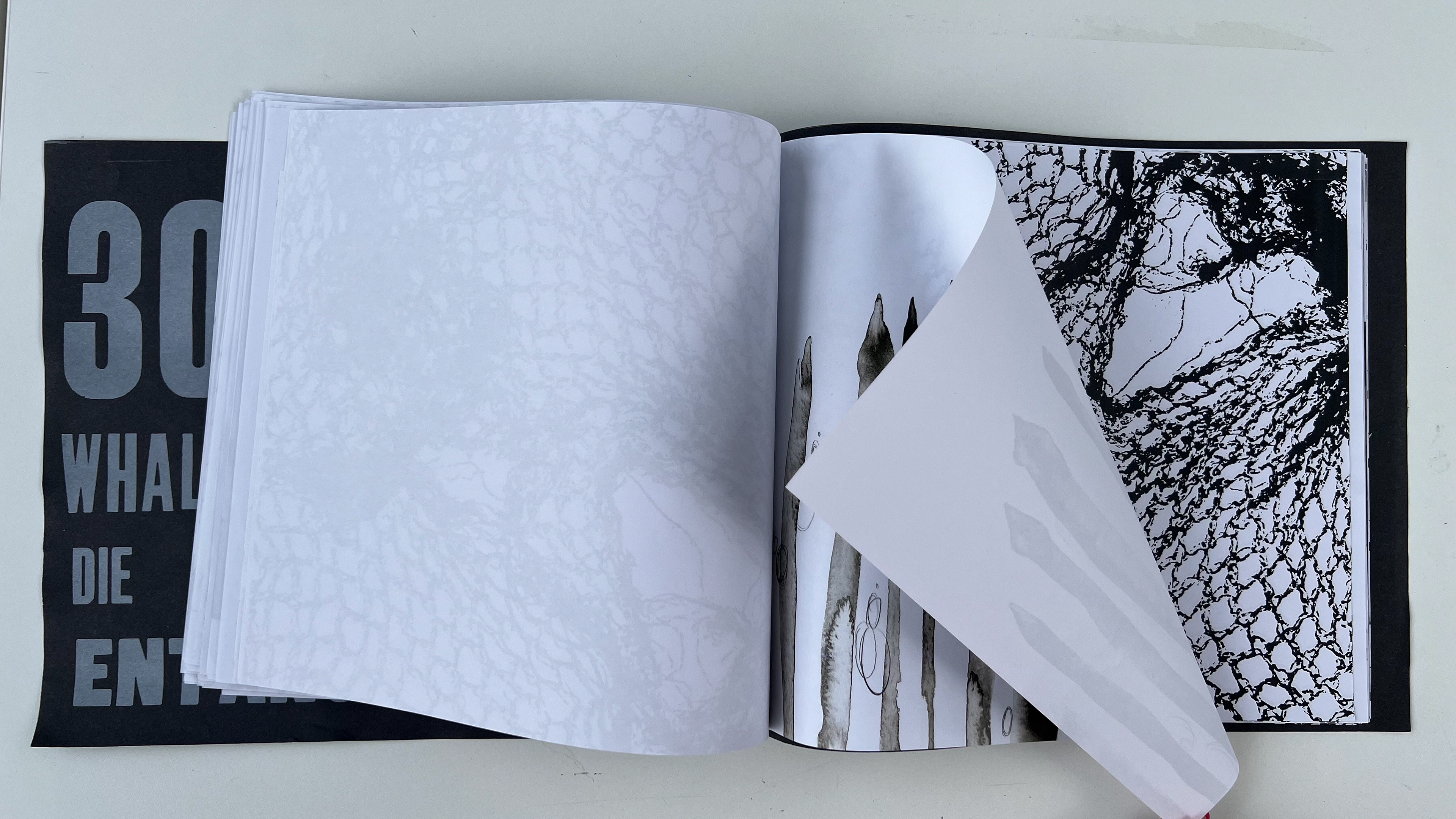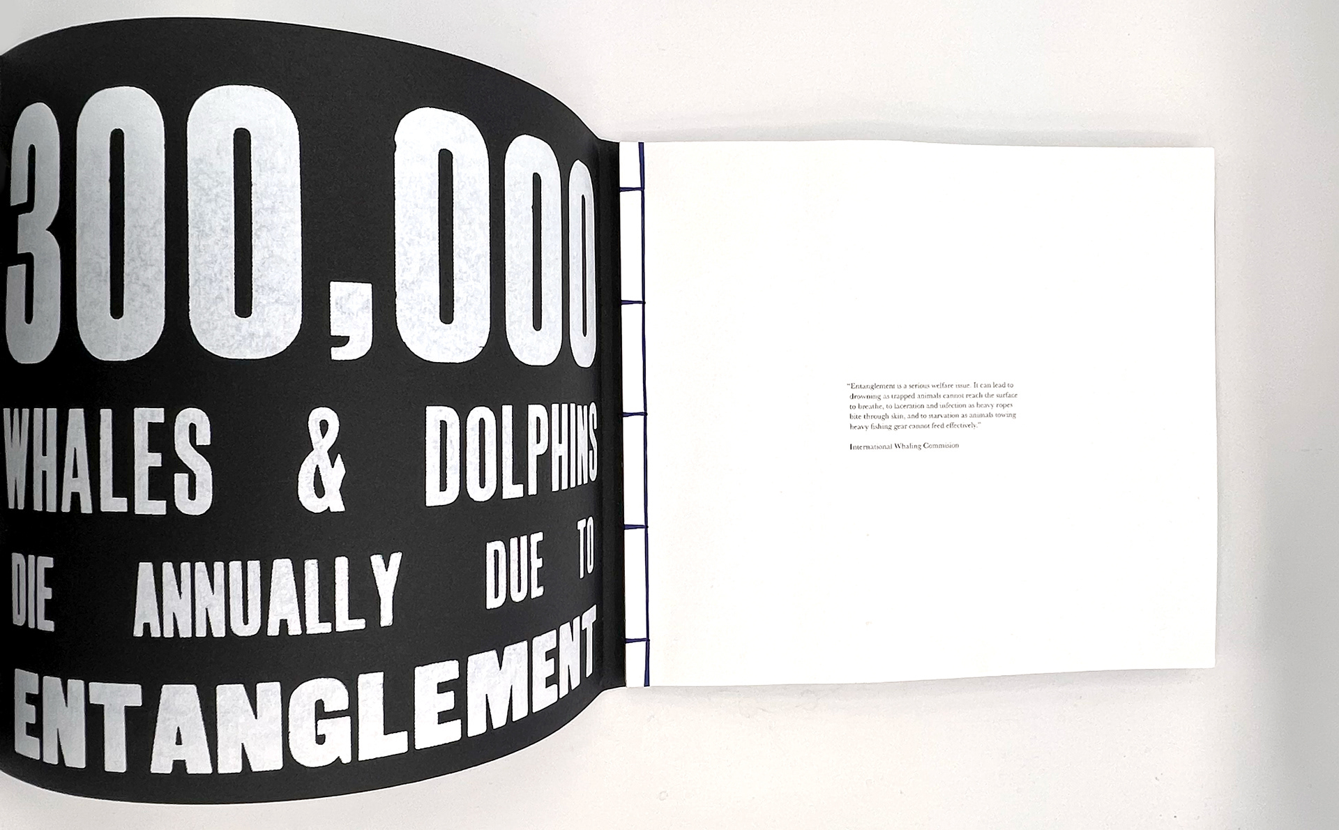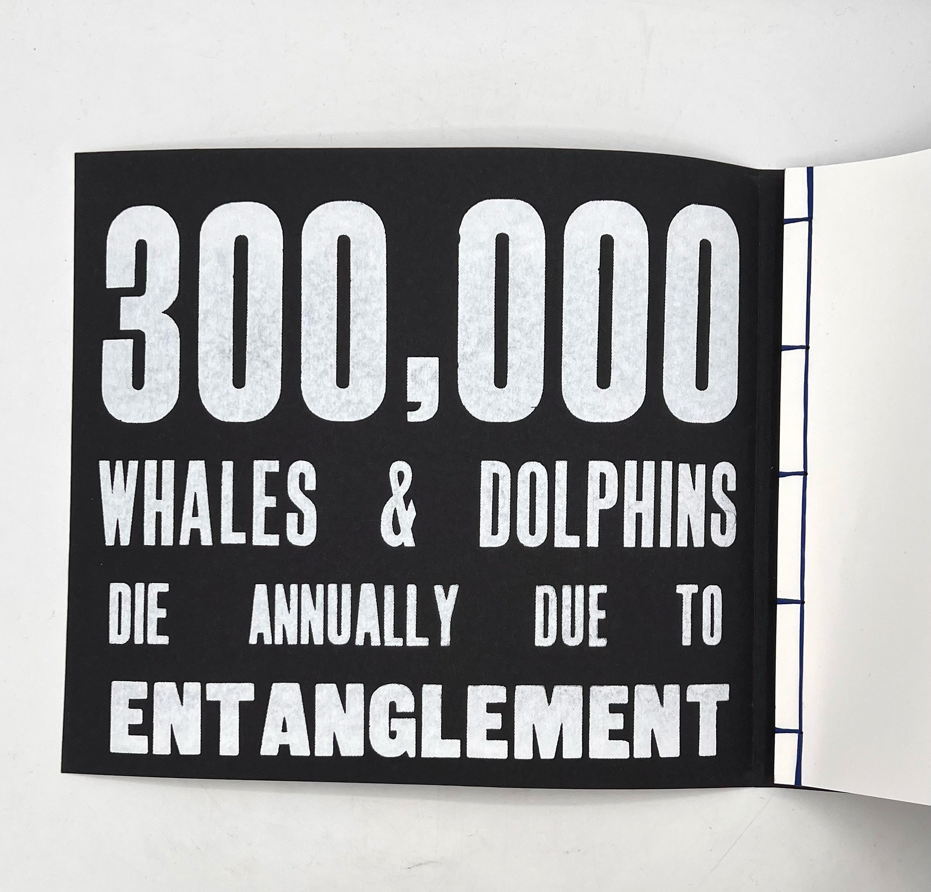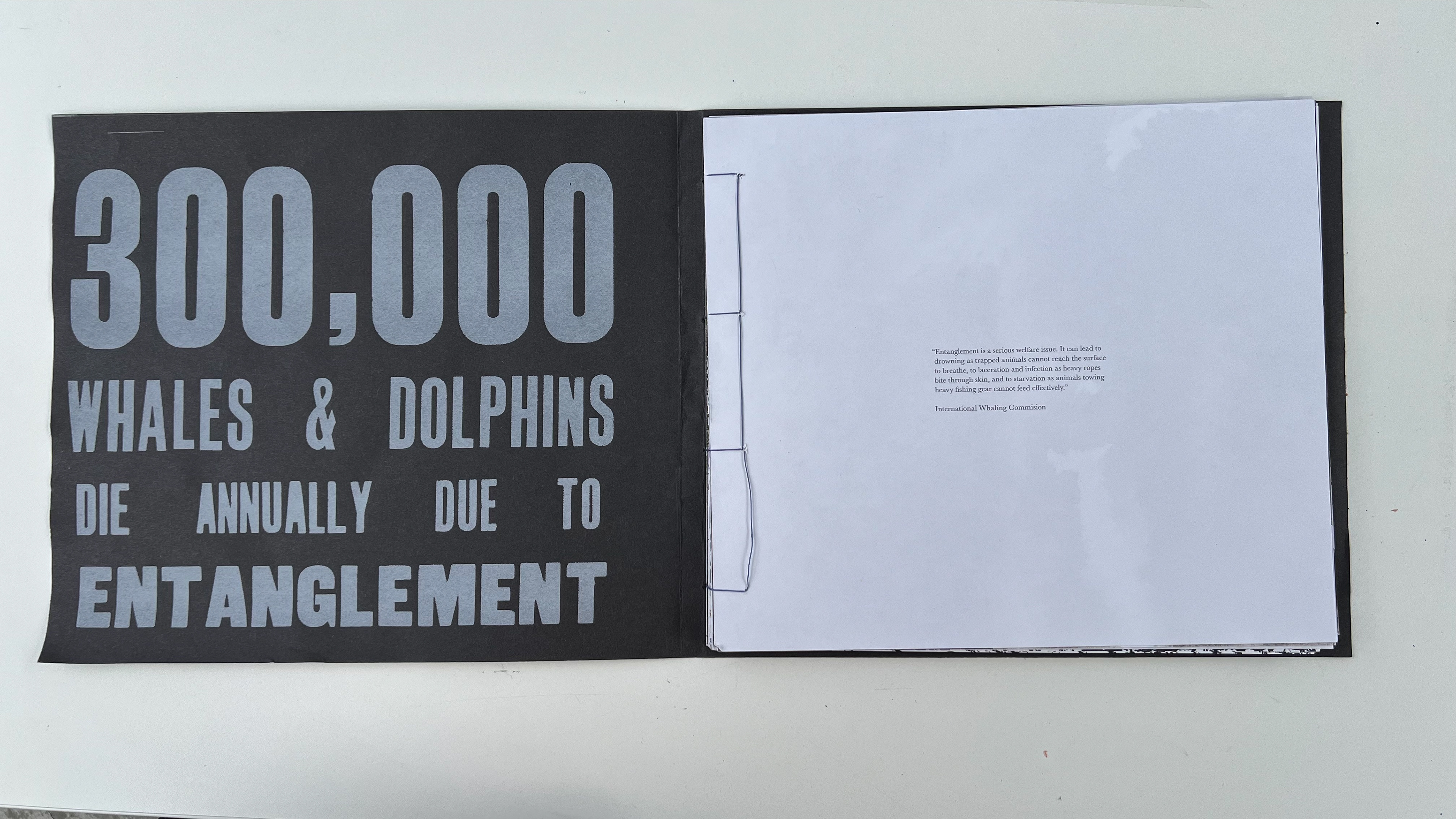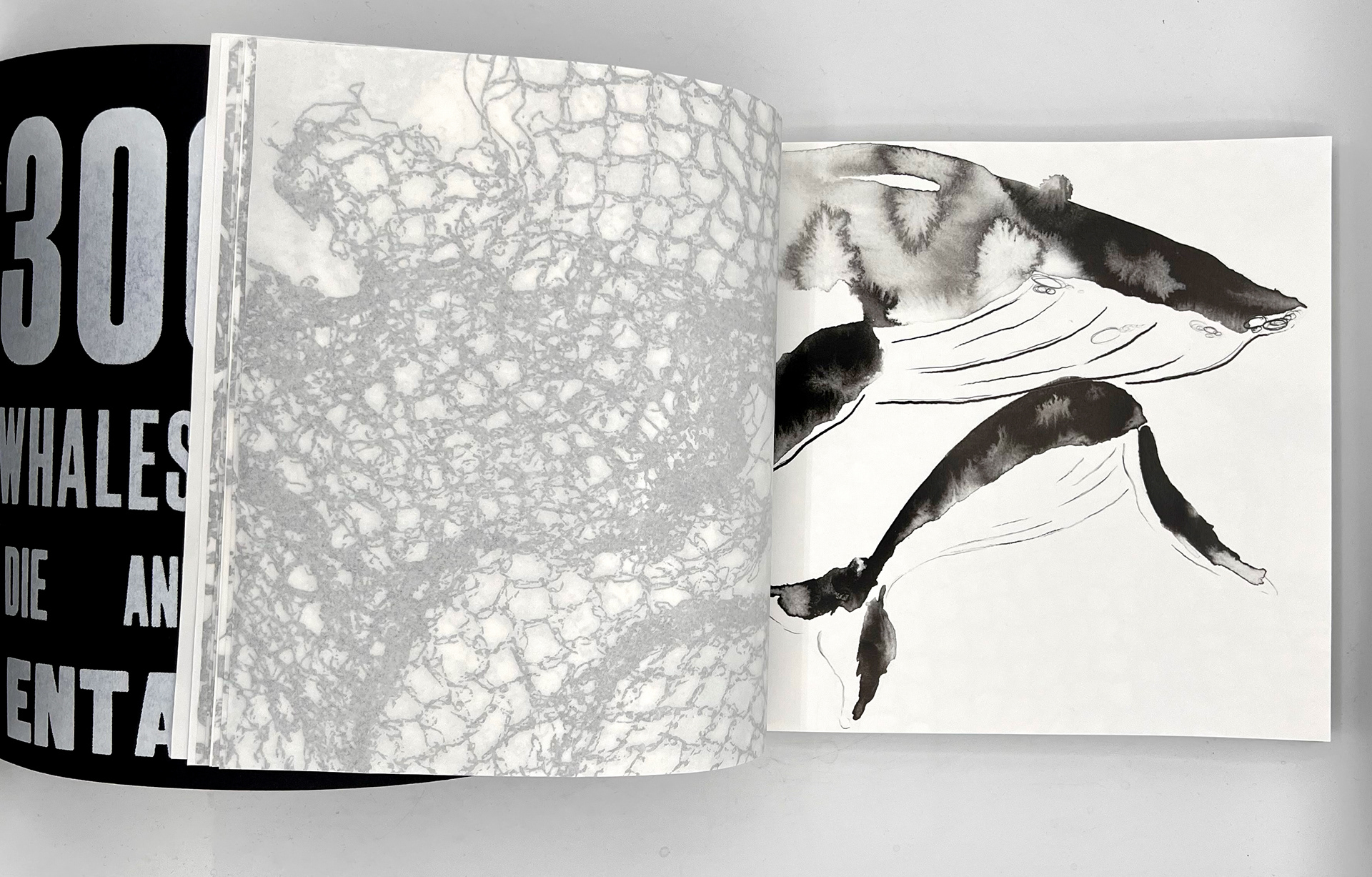 This publication embodies a stark ratio emerging from research: for every whale or dolphin lost to entanglement, four fragments of fishing gear persist. The publication, a 100-page visual reckoning, captures the tension between survival and loss within the marine ecosystems that sustain us. Its central imagery stems from monoprinted textures of a fruit net, an everyday object reimagined as the ghost nets that haunt the oceans. This texture acts as a visual anchor across the project, informing the publication and other responses.