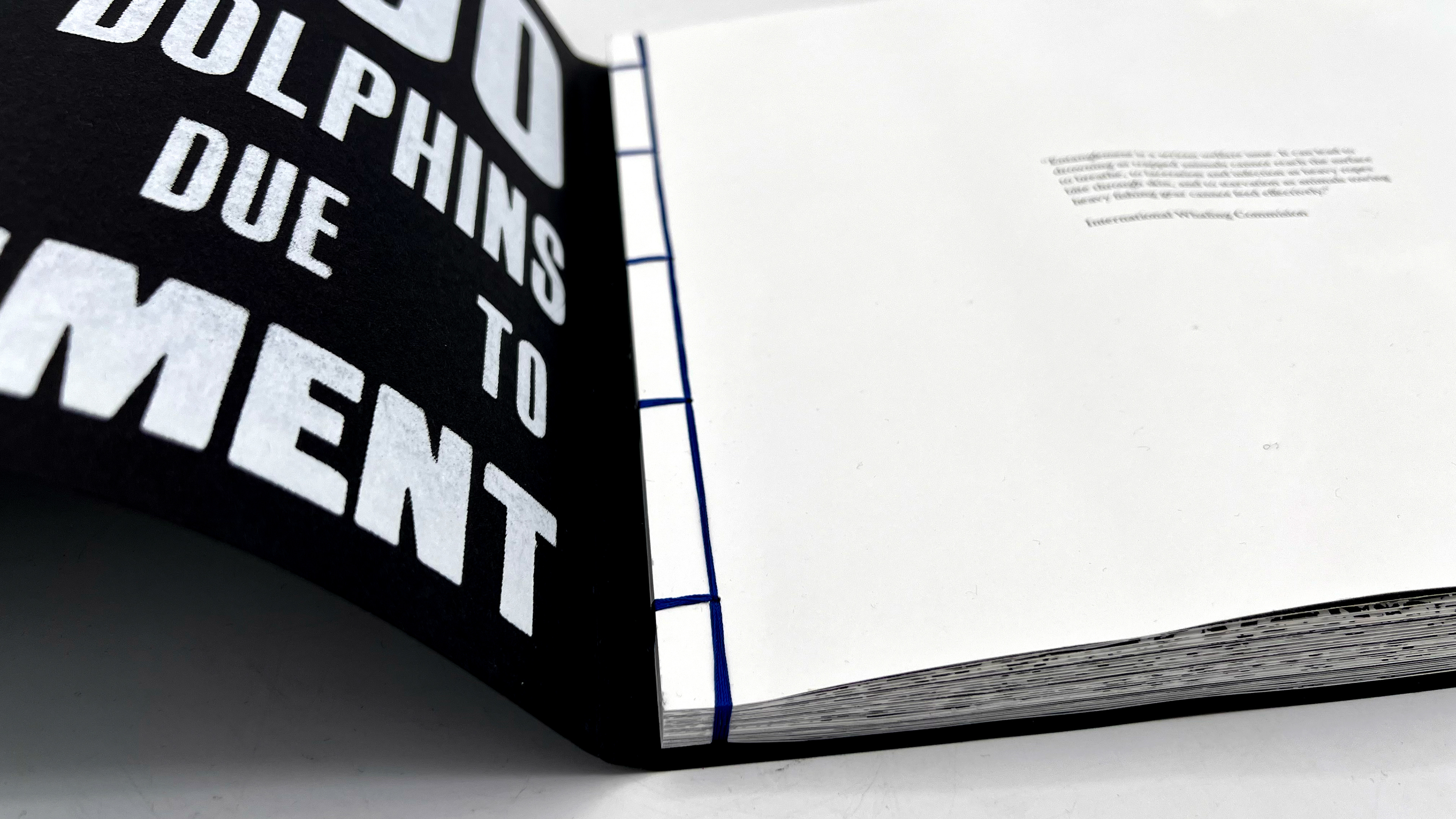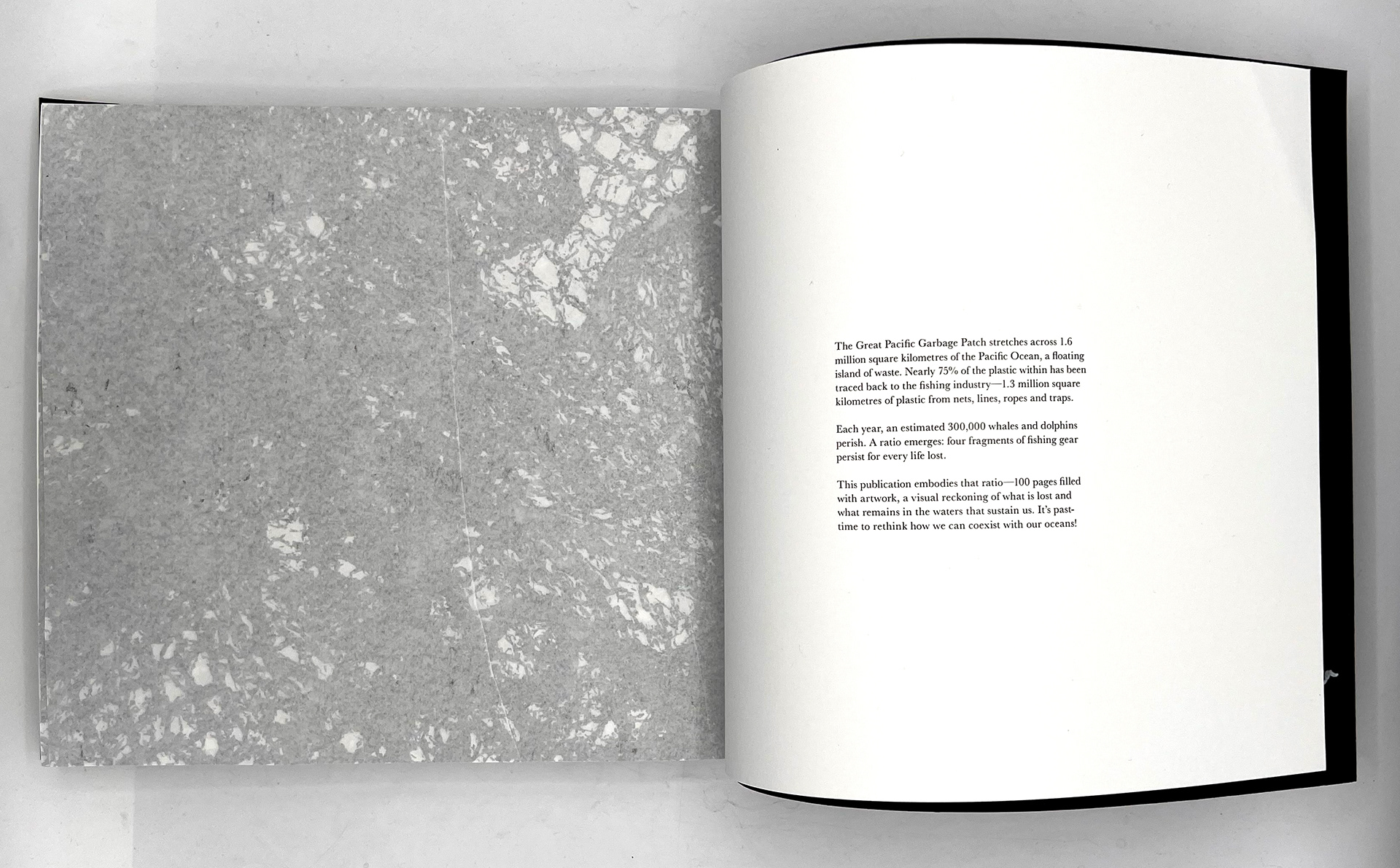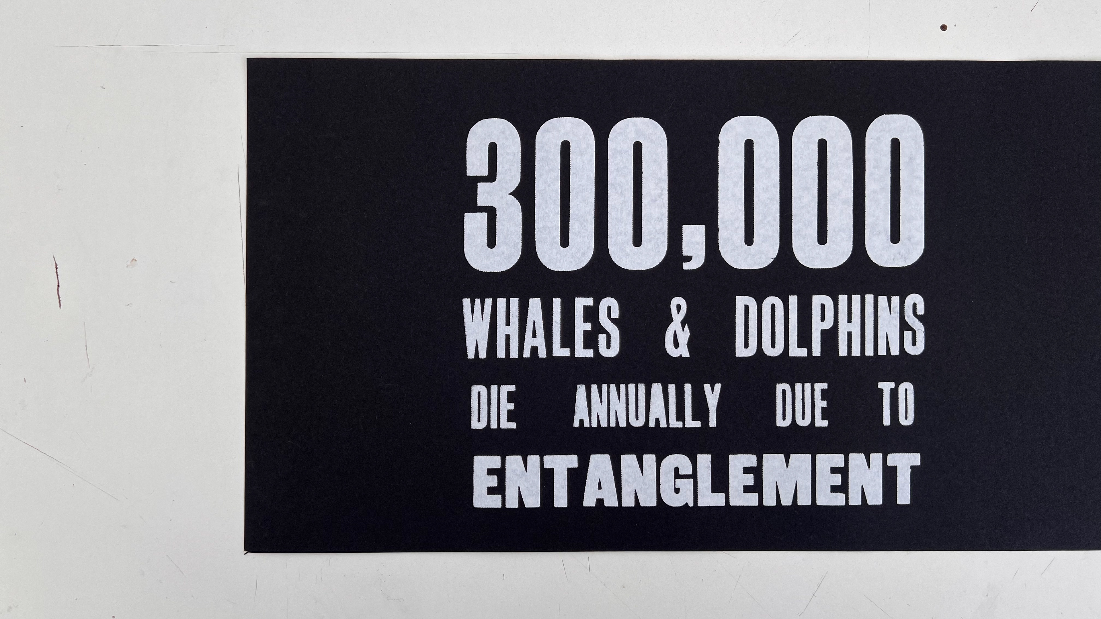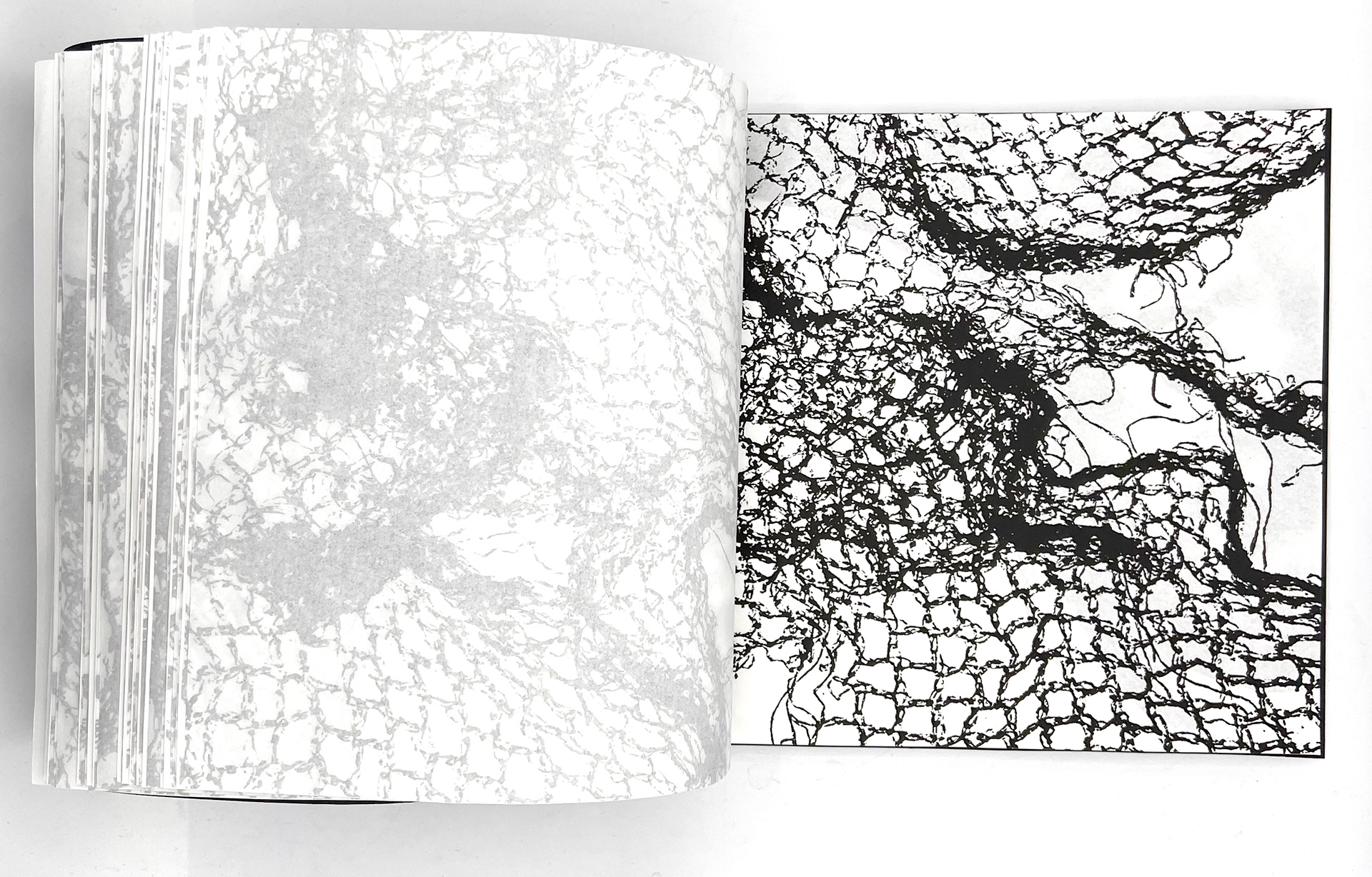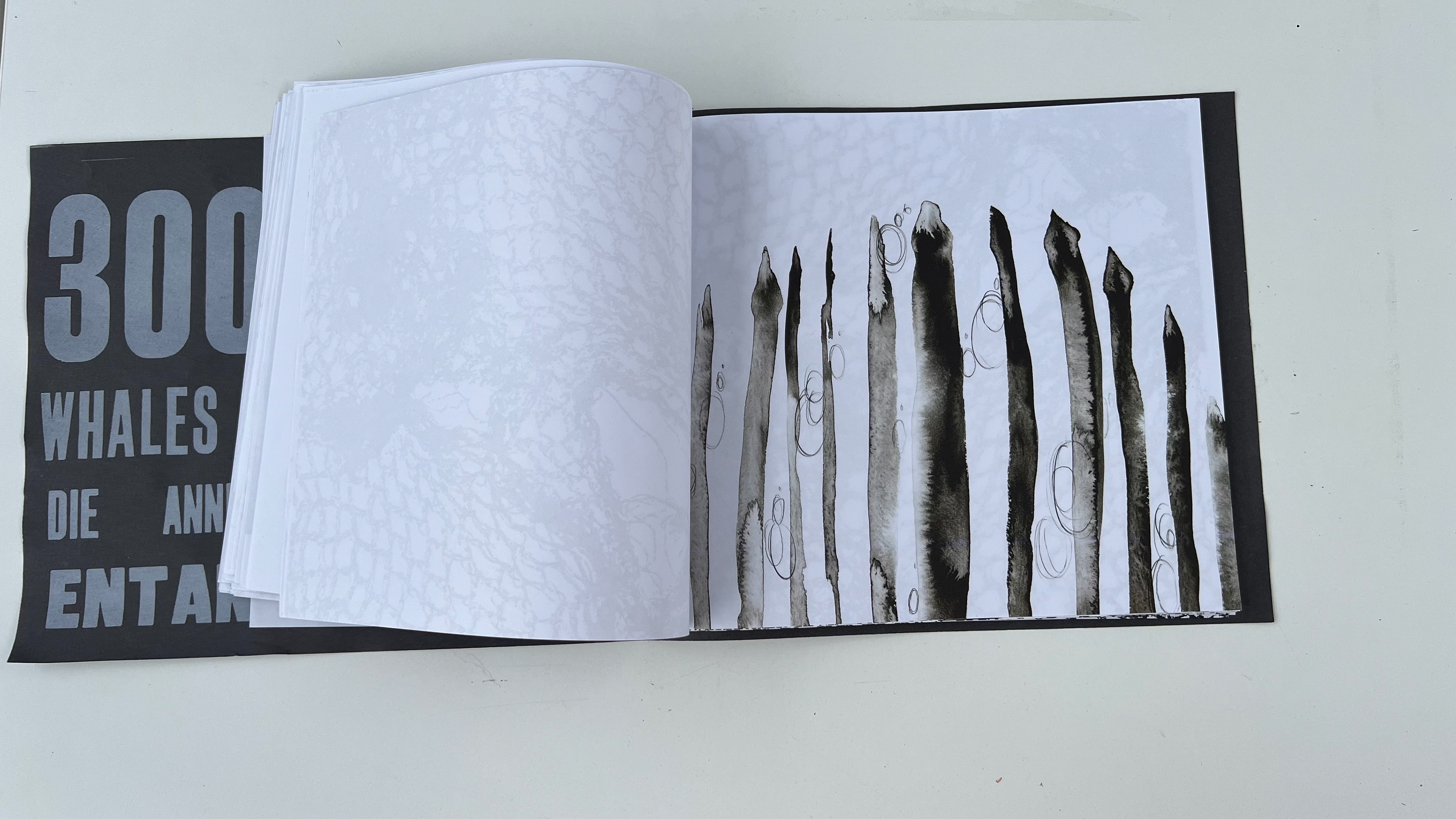 This publication embodies a stark ratio emerging from research: for every whale or dolphin lost to entanglement, four fragments of fishing gear persist. The publication, a 100-page visual reckoning, captures the tension between survival and loss within the marine ecosystems that sustain us. Its central imagery stems from monoprinted textures of a fruit net, an everyday object reimagined as the ghost nets that haunt the oceans. This texture acts as a visual anchor across the project, informing the publication and other responses.